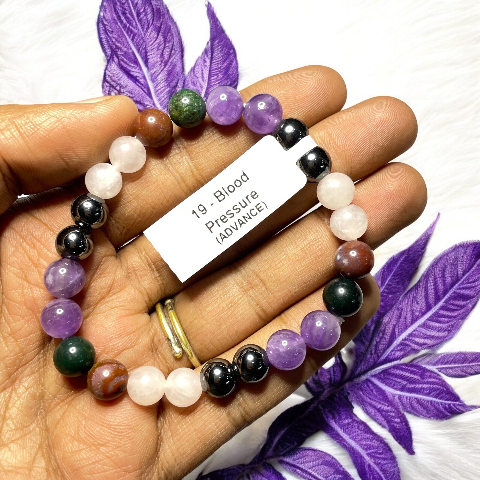 Hematite helps you stay grounded, improves circulation, and balances body energy. Amethyst calms the mind, reduces stress, and supports emotional balance for healthy blood pressure. Rose Quartz promotes heart healing, emotional harmony, and better circulation. Bloodstone cleanses the blood, supports heart health, and boosts overall vitality.